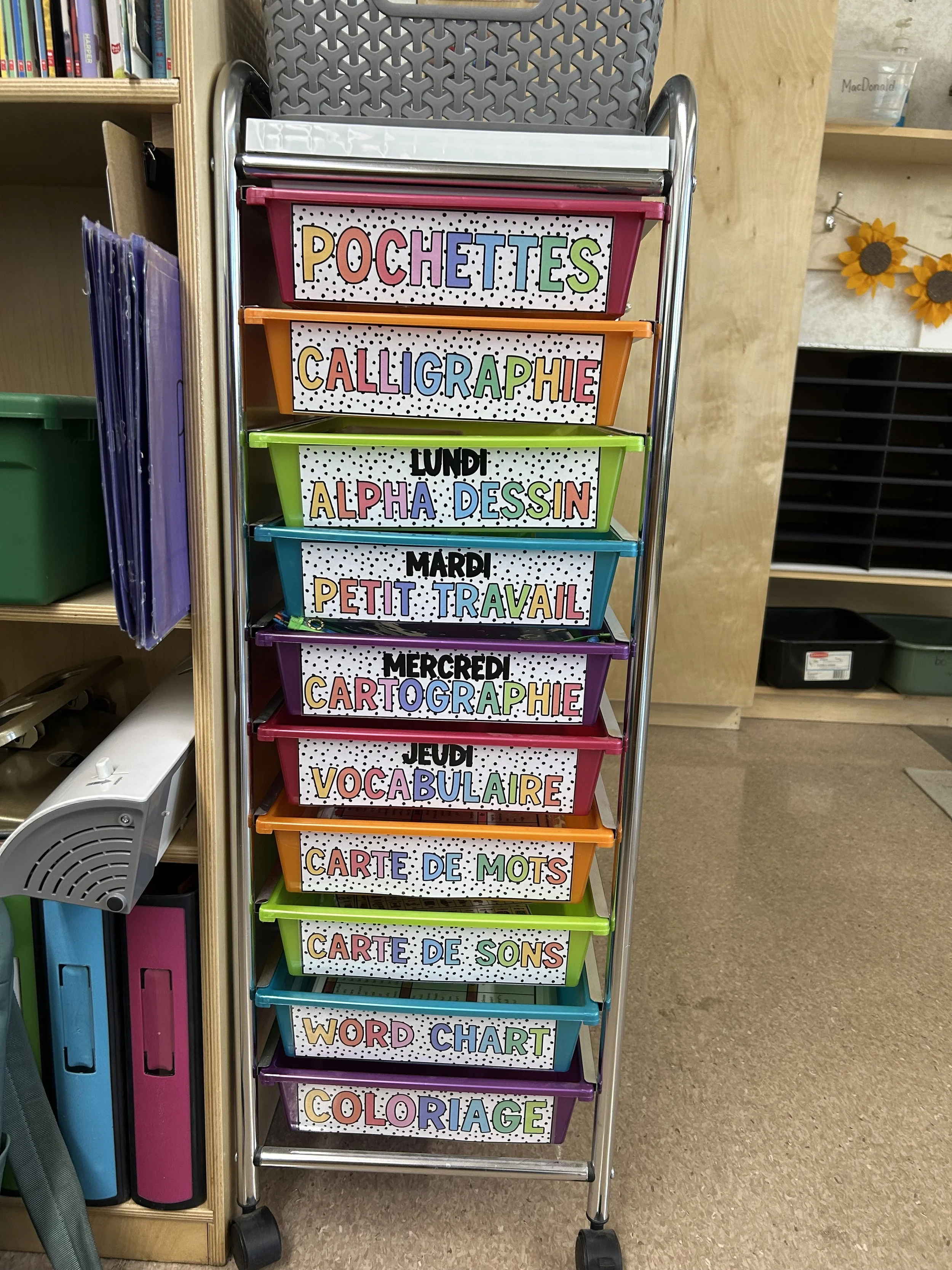 Start with functionality first, then if it works for you, make it pretty later. I do have a lot of matching bins but they’ve been collected through the years, they weren’t like that for the first several years, I had some wild colours and big mixes of different things. I’ve used some of my classroom money over the years to get things I wanted and I’ve had to change some based on the built in shelving sizing but…don’t panic if you're not Pinterest worthy on day 1 or day 1000.